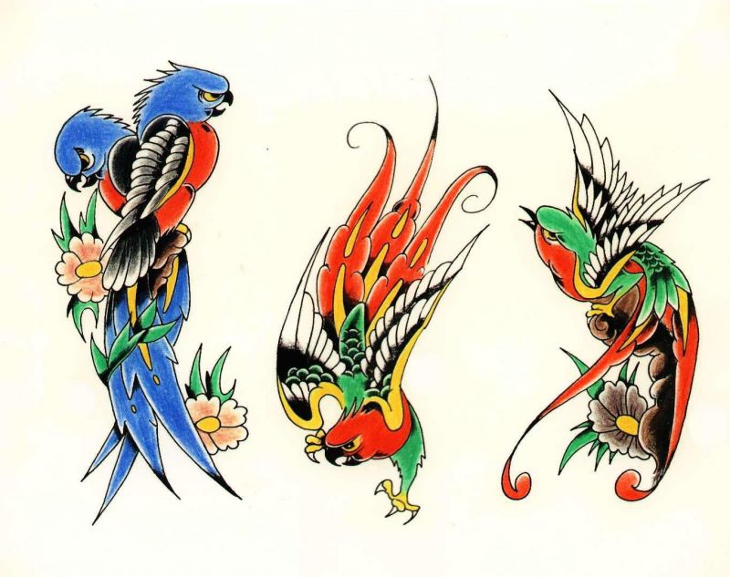 Design for tattoo with birds and flowers. Colourful plumage.