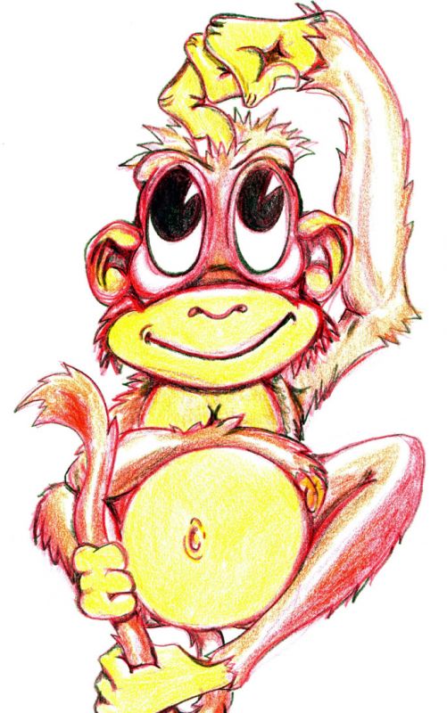 in yellow and brown colours. Pattern is so funny. Monkey is sitting and scraping head.