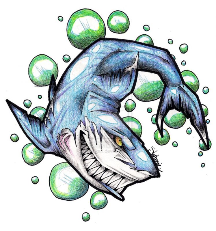 which look so aggressive. Shark show one's ivories. Among animal are green drops of water.