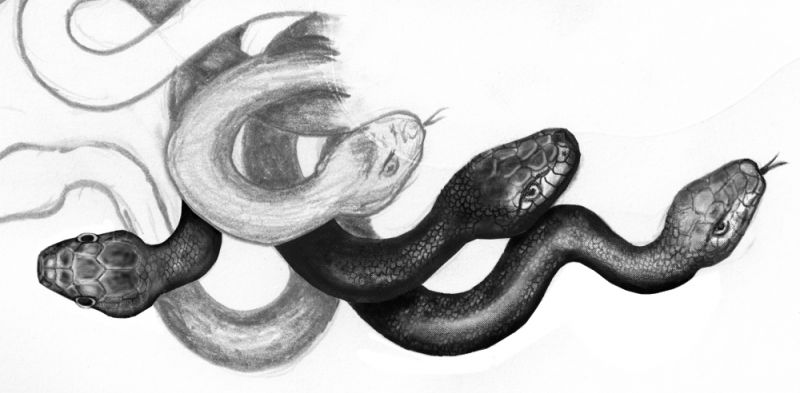 Tattoo project with snakes. Heads of snakes in black and grey colours.