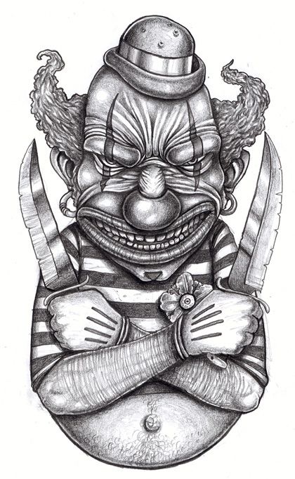 , he look like prisoner and hold in hands two knifes. On head clown have small hat. Nice design for me.