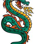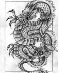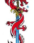 in tribal style. Dragon have wings and long tail which is end by arrow. Tattoo design in black colour.