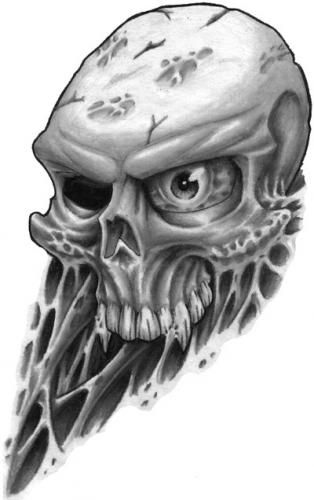 which i saw. Dark colour look great in this project. Skull has only one eye. In background we can see elements of skin and muscle.