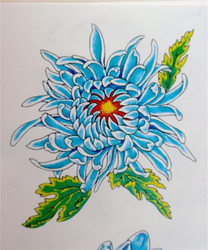 Chrysanthemum is very popular flower in many cultures. On this picture we present blue chrysanthemum with three small leafs. Great idea for tattoo.