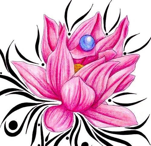 with tribal elements in black colour. Lotus have many petals. On one of the petals is small pearl in violet colour.