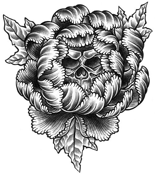 with big peony. Flower have many petals, among petals hold back a skull. Something reall good for tattoo.