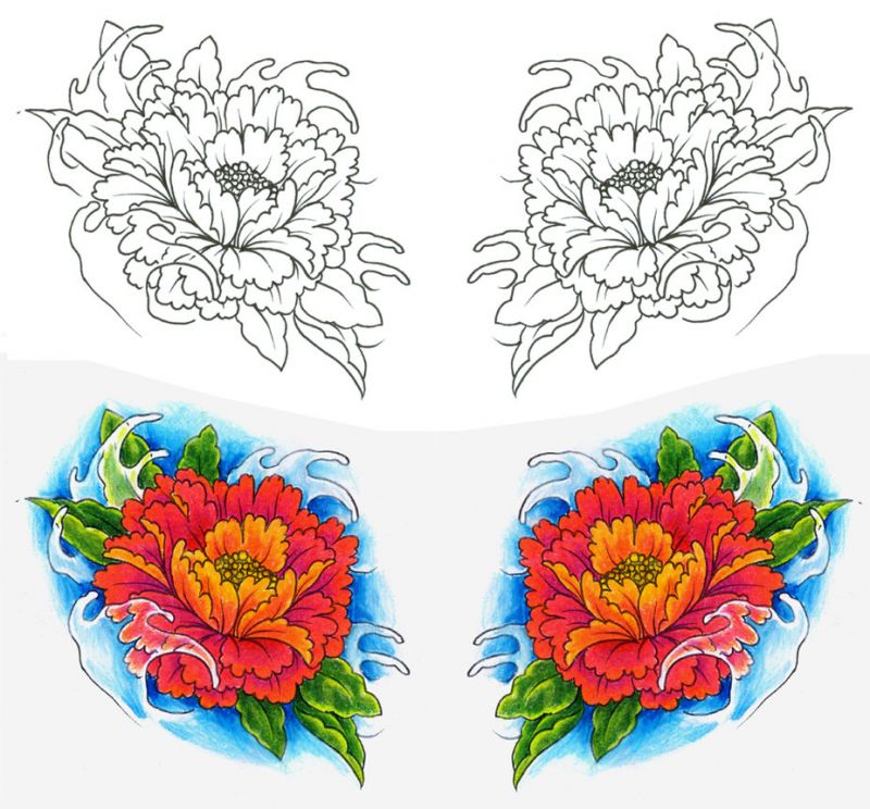 . First peonies are black outlines, second present colourful peonies with green leafs on blue background.
