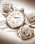 Attractive pattern of the tattoo with skulls, candles and roses. There are three burning candles in the middle. After of them left and for the right side there are skulls. Branches and creepers are wrapping the whole with roses.