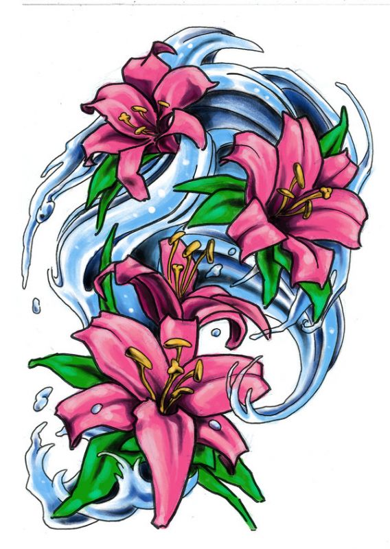 . Lily have pink colour, water of course is blue. Very good tattoo design, i like this motive.
