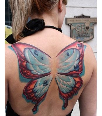 Tattoo on the back with butterfly wings. Thw wings have big size. Fantastic motive in blue and red colours with small drops of water. It's real cool body art.