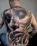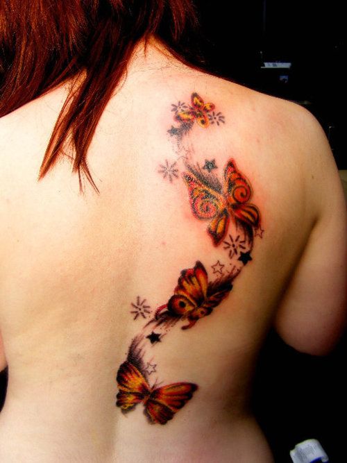 Back tattoo with butterflies. The insects are black and orange. Four butterflies in various size with amazing patterns on the wings.