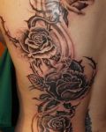 Big tattoo on the back with tiger. The animal is into black stripes. The tiger is looking out as if roared.