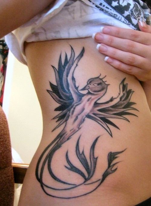 Awesome tattoo with black phoenix. His big wings look fantastic. It's a magic bird.