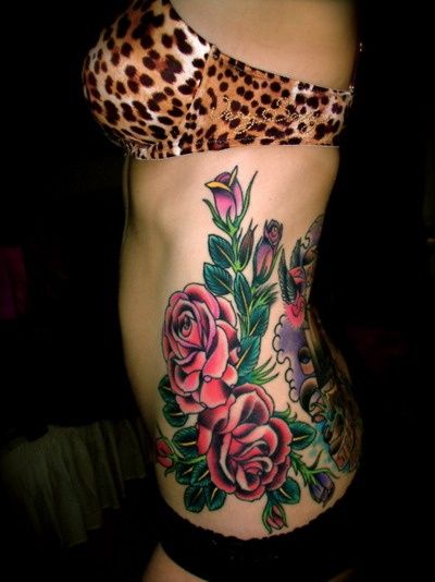 Photo of girl with tattoo on the belly. It's a floral motive with red roses among green leafs.