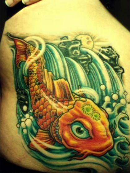 Tattoo on the belly with gold fish on the water. Fish is big and have blue eye.