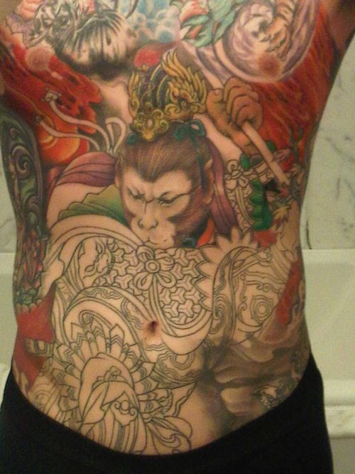 Tattoo in big size, project on the belly with a few motives. In the middle of belly is brown monkey.