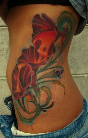 Tattoo with three flowers on belly. Plant are colourful and have big size. Flowers look like morning glory.