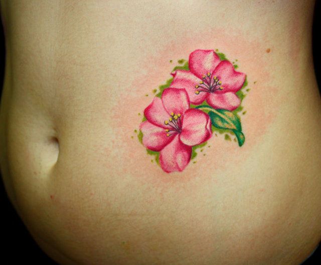 Tattoo with red flowers and green leafs. It's a hibiscus flower, very popular tattoo design among girls in Hawaii.