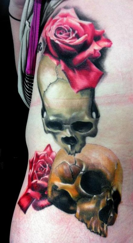 Tattoo with two skulls - white and yellow. There are two flowers too. Red roses with big petals. Very interesting composite, these motives are often added.