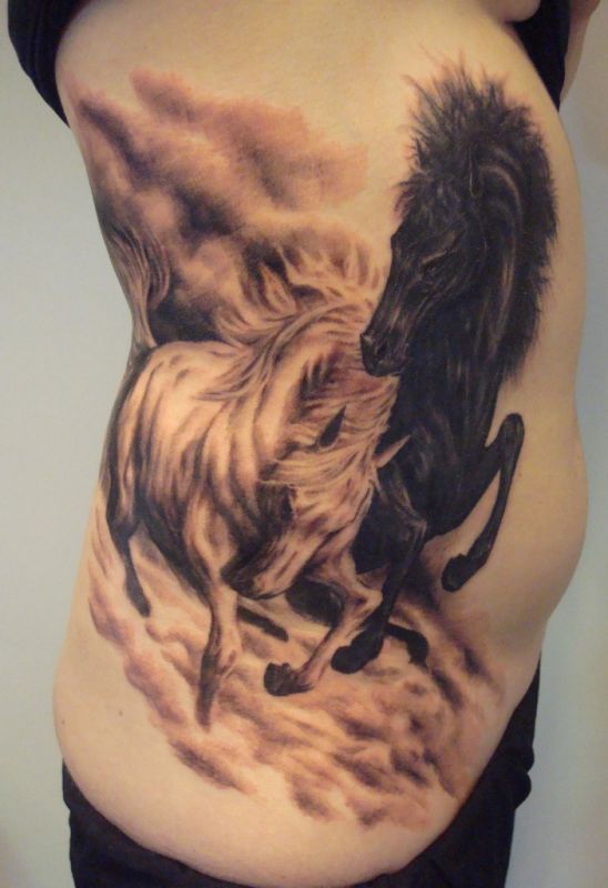 Tattoo with two horses, one of them is black, second white.