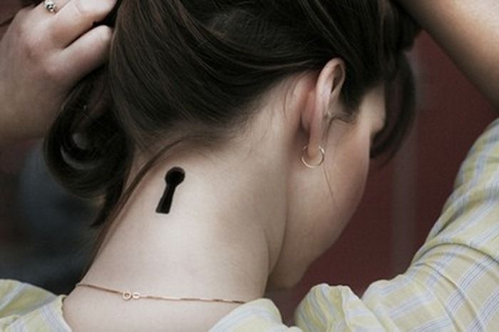 Idea for tattoo with small design. Girl has a keyhole on the neck.