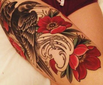 Tattoo on hip with black bird and red flowers.