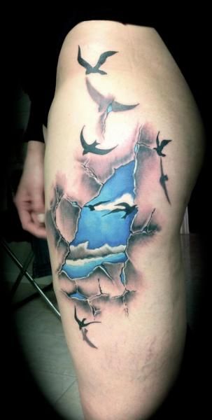 Perfect tattoo with part of the blue sky and birds. Project on hip which look like under the skin.