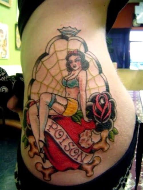. She is sitting on big apple with word "poison". Moreover ther is rose, bones and spider web.