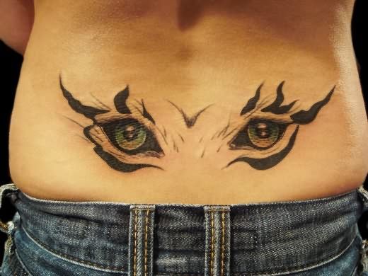 Photo present good tattoo on lower back. Design with tigers eyes.