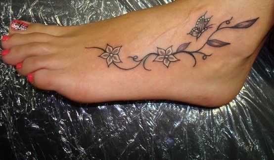On the photo is tattoo with flowers and small butterfly. It look so nice.