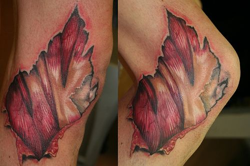 Fantastic tattoo on the knee. It look very natural, it's a kind of biomechanical design with muscles.