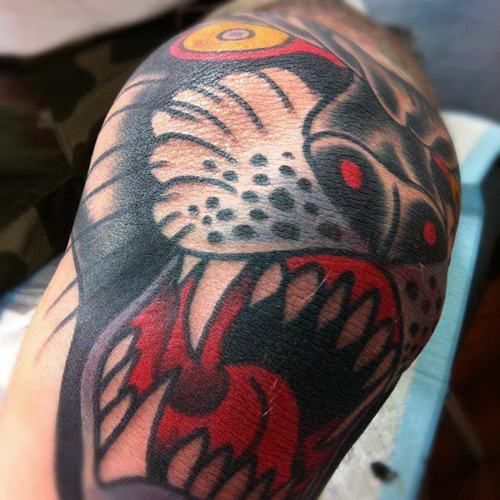 Colourful tattoo with black panther. Animal have long teeth in white colour.