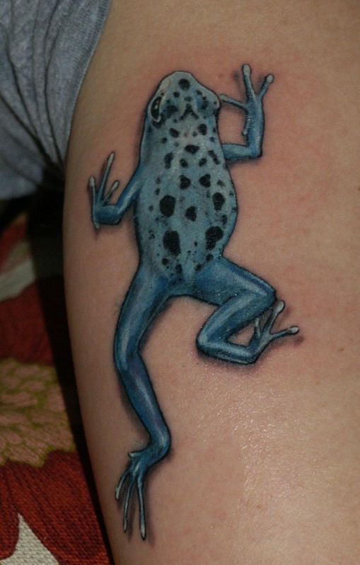 Funny tattoo with frog. Skin of frog is blue with black spots.