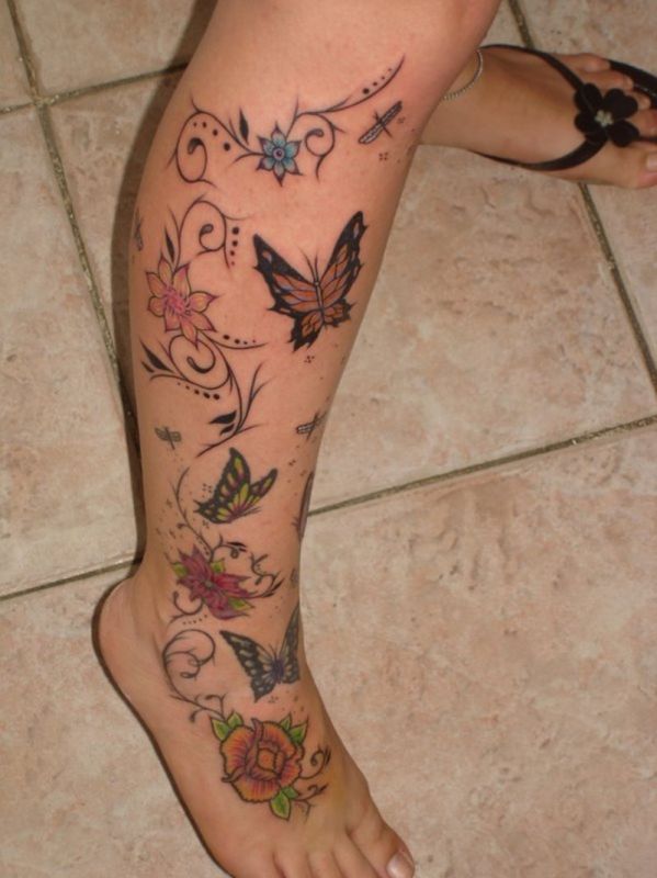 Tattoo with flowers and butterflies on the right leg.