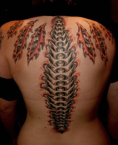 Great tattoo with spine. It's a king of biomechanical tattoo design. Present fatastic.
