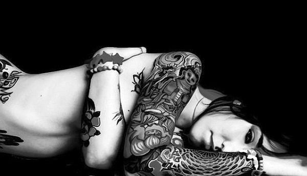 Photo of girl with tattoos. She has a few tattoo in various part of the body. The biggest of tattoos is on the arm.