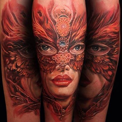 Arm tattoo with colourful face of woman. she have great mask on face. Mask of feathers. Girl with dark eyes and red lips. Very good tattoo, congrats for artist.