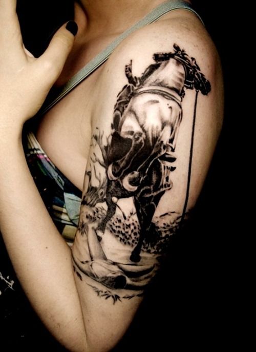 Tattoo presenting the motive for the horse. The animal is standing on back paws. Colour of the project is black.