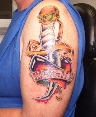 Silver and gold knife with skull at the top. A knife is put into the heart.
