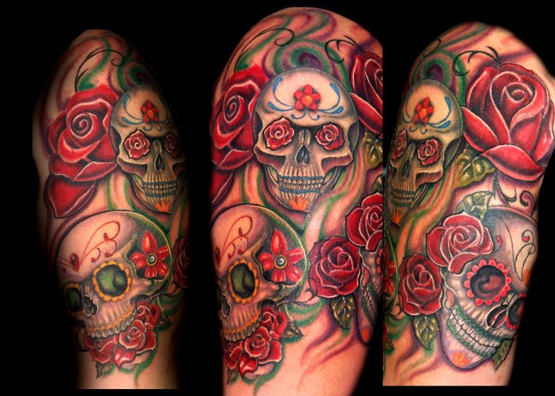 Fantastic tattoo with skulls and flowers. Great arm sleeve.