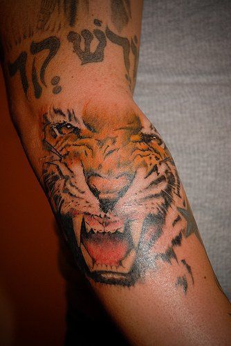 on elbow. It look fantastic, design is colourful and present angry tiger.