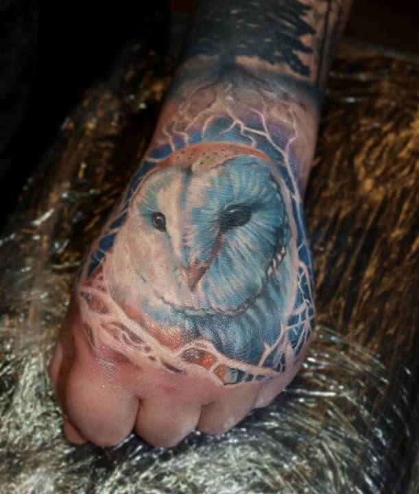 Hand tattoo with white owl
