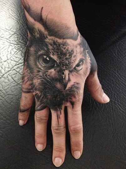 Amzing tattoo with owl. Head of bird on hand. Very good details and nice colours.