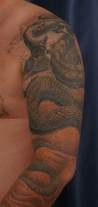 Amazing tattoo on all hand. Snake look very narural. Great sleeve tattoo.