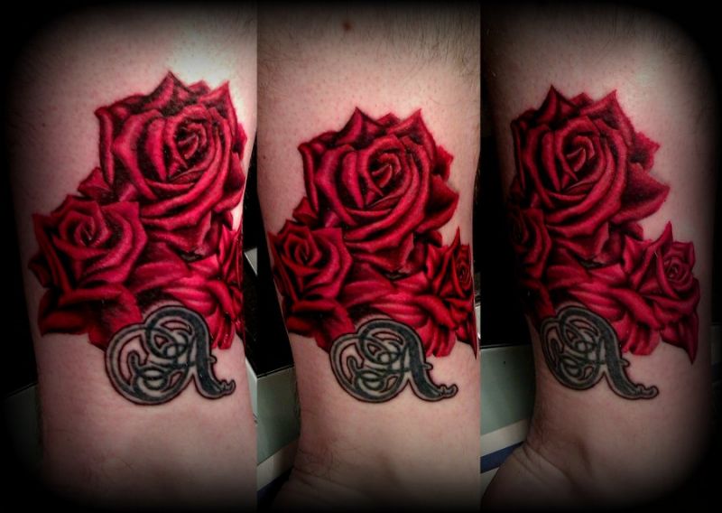 Wrist tattoo with three red roses and black sign. It's a avery good tattoo.