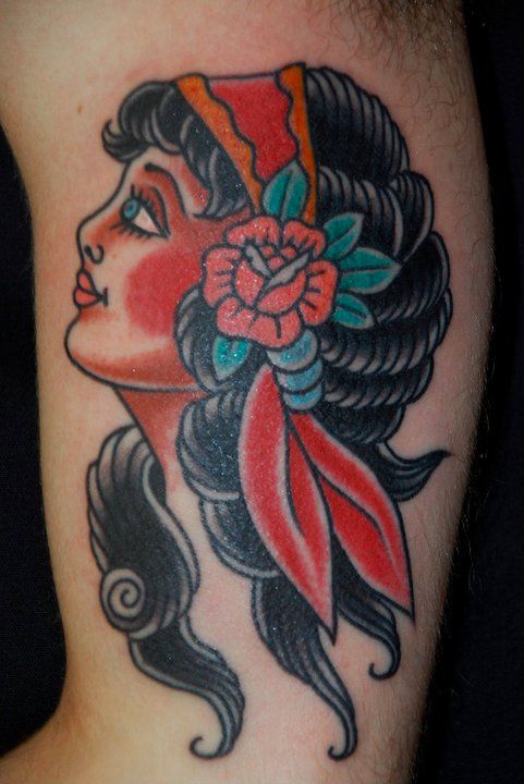 Woman with black hair as tattoo design. On hair she has red ribbon and rose flower.