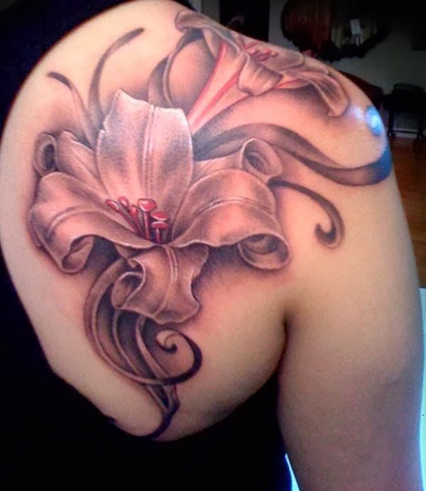 Floral motive as tattoo on the shoulder. Lilies with long leafs.