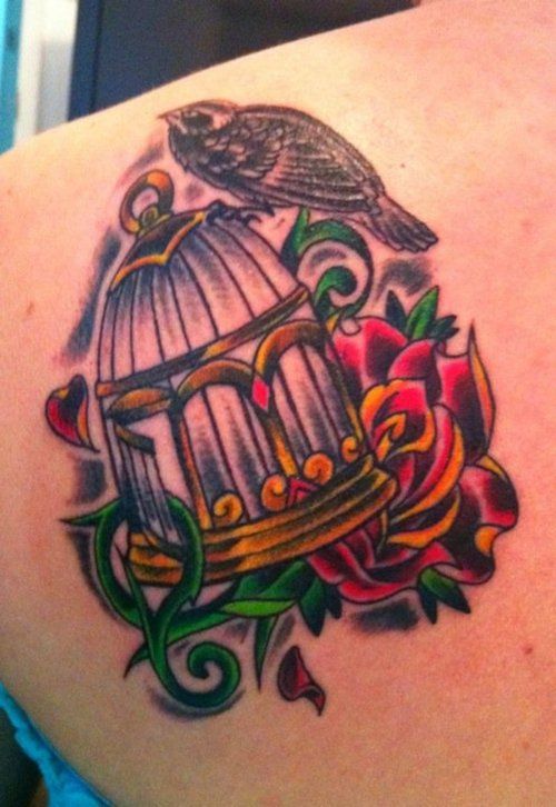 Tattoo in colours with birdcage, rose and bird. The bird is sitting on the birdcage in black and gold colours. The magpie have a dark plumage. Rose is red and orange with green leafs.