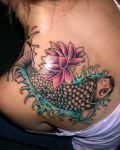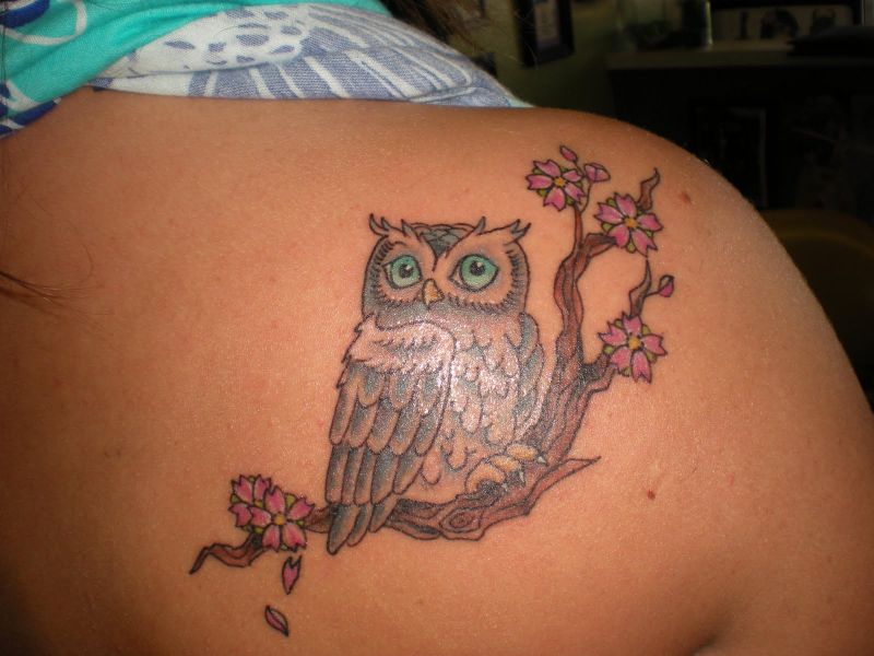 Tattoo with owl. The bird are sitting on stem of cherry blossom. Good design.