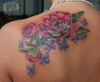 Flower tattoo with peonies and violets. Peonies are pink, violet less purple.